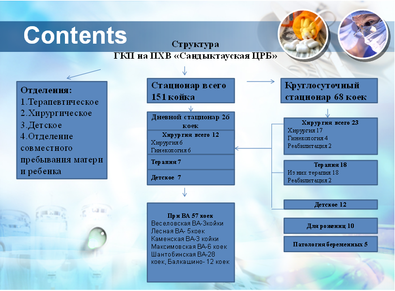 Мощность круглосуточного стационара Сандыктауской РБ представлена 4 отделениями: терапевтическое, хирургическое, детское, отделение совместного пребывания матери и ребенка. Коечная мощность - 49 и 280 посещений в смену .