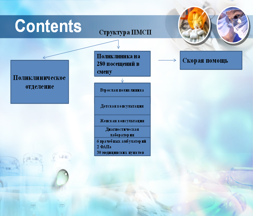 Поликлиническая помощь оказывается по 17 специальностям, мощность 250 посещений в смену.